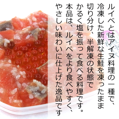 ) ご飯のお供や晩酌のおつまみにちょっと贅沢な「紅鮭親子ルイベ」はいかかですか? ルイベとはアイヌ料理の一種で、冷凍した新鮮な生鮭を凍ったまま切り分け、半解凍の状態でかるく塩を振って食べる料理です。